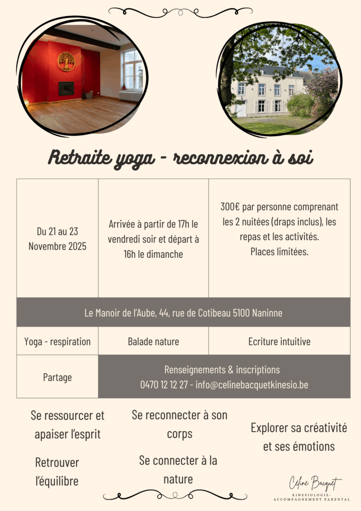 Dans le cadre magnifique du domaine, nous prendrons le temps de respirer pleinement, de nous relier à la nature et de partager des instants chaleureux.